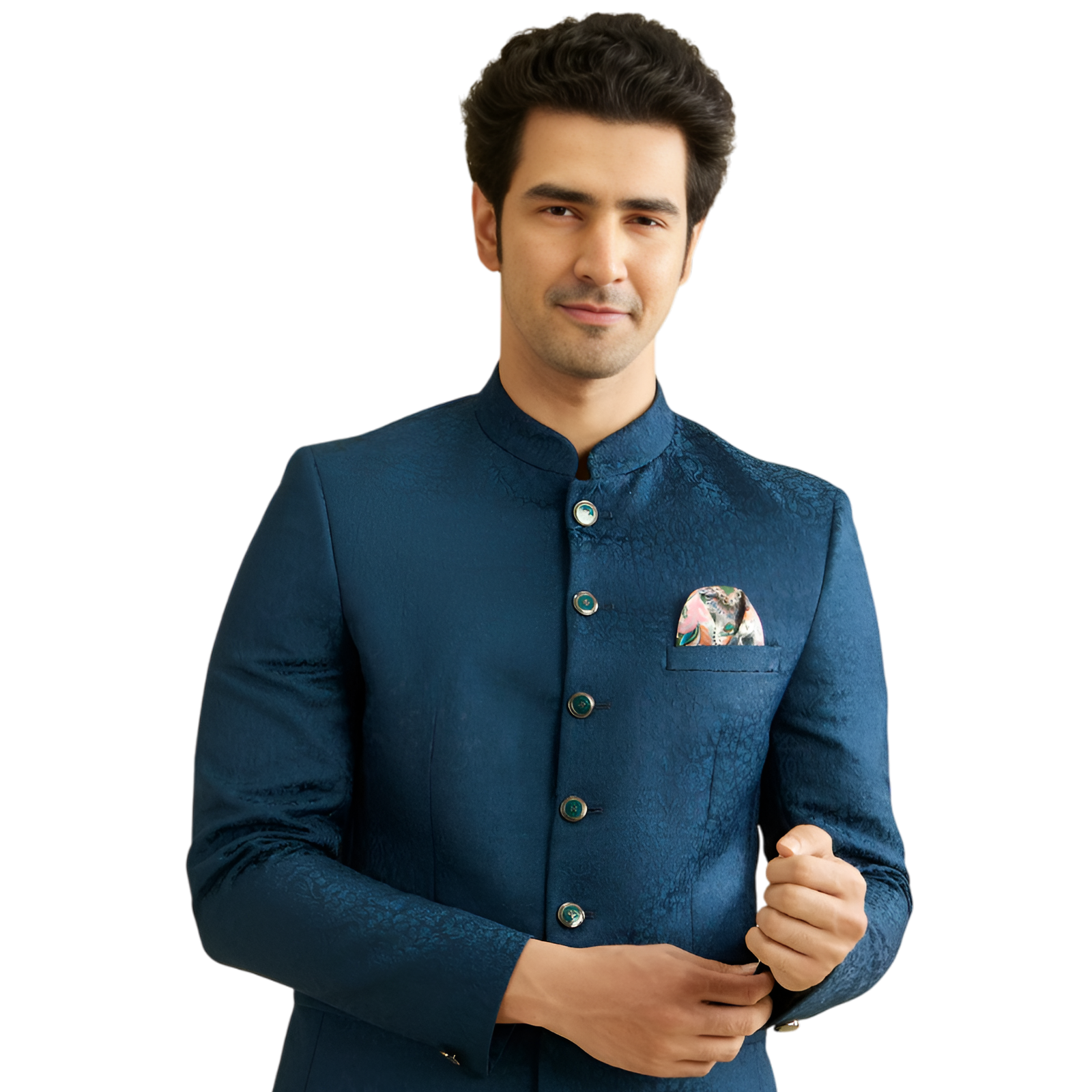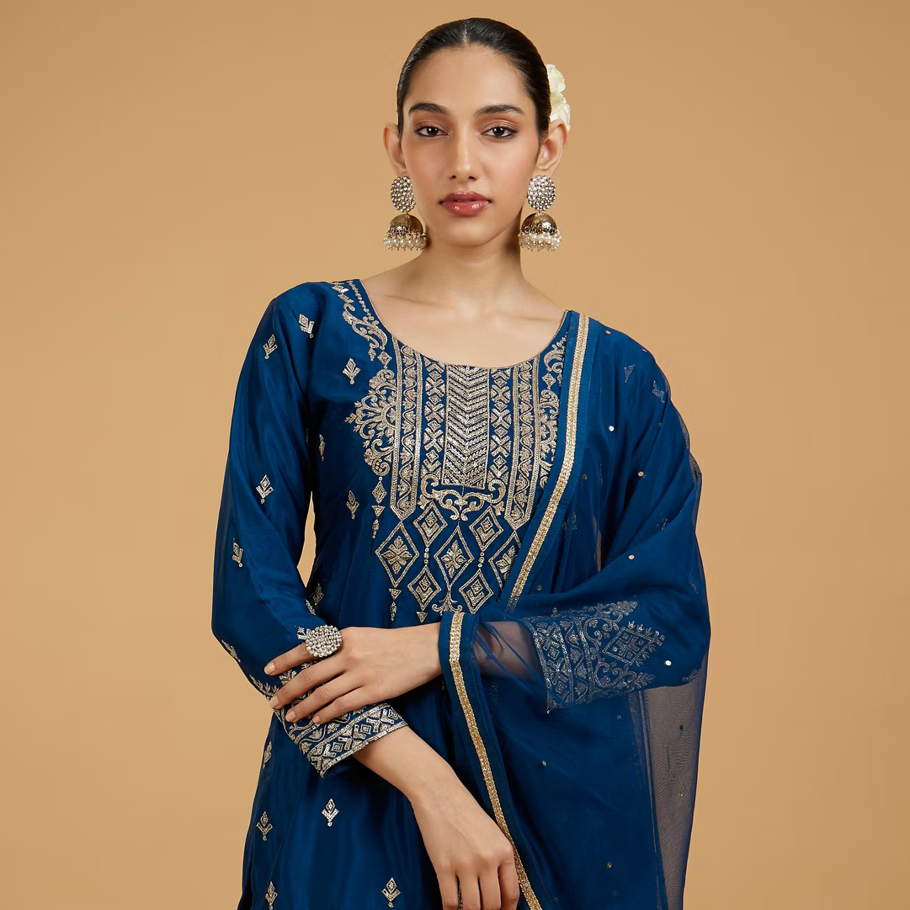 Teal Blue Anarkali Suit Set with Linear Buta Embroidered Kurta & Potli Button Trims